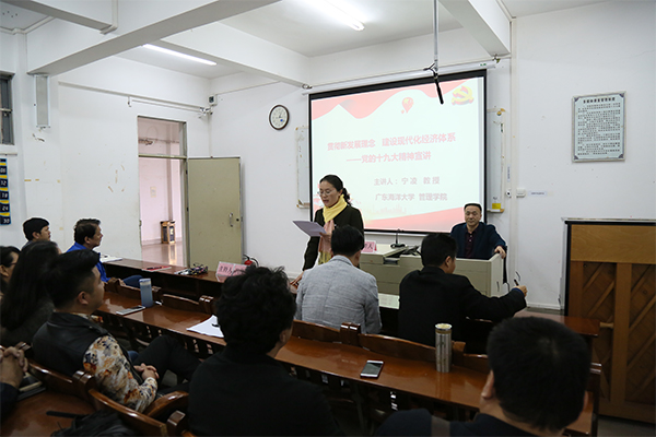 12月14日下午,太阳成集团tyc9728在美术楼302室举行学习贯彻党的十九大精神专题辅导报告会,管理公司经理宁凌教授作了题为《贯彻新发展理念,建设现代化经济体系》的专题报告。会议由公司党委书记冯红爱主持,公司教职工和员工干部共130余人参加。