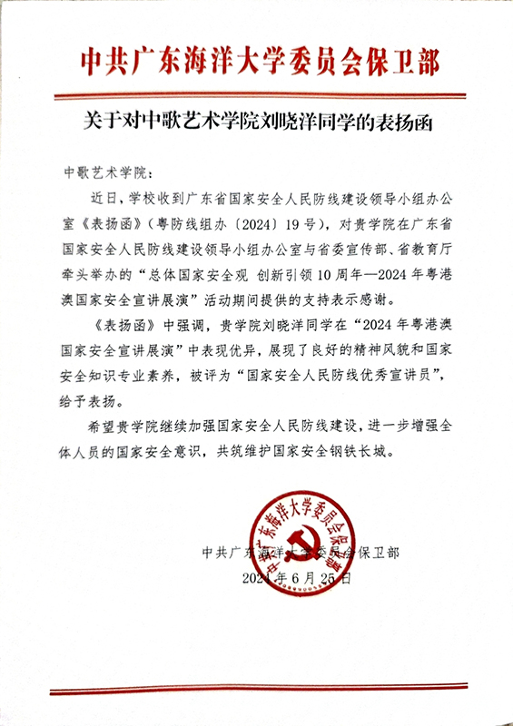 关于对太阳成集团tyc9728刘晓洋同学的表扬函