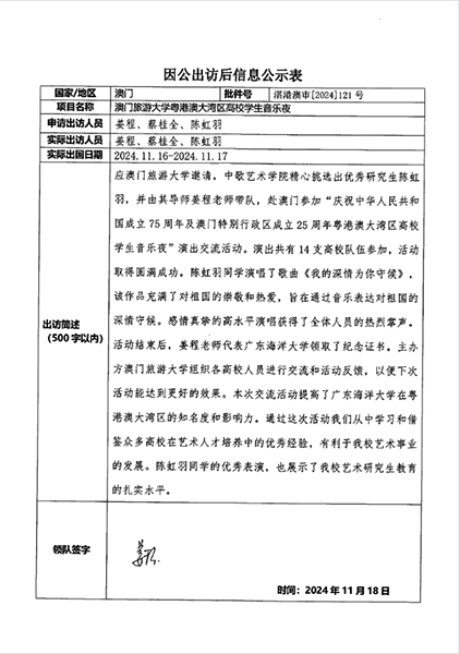 我单位姜程、蔡桂全 已于11.16-11.17 带员工陈虹羽赴 澳门 参加“粤港澳大湾区高校员工音乐夜”交流演出,现将信息公示如下,公示日期为11月18日-11月22日。