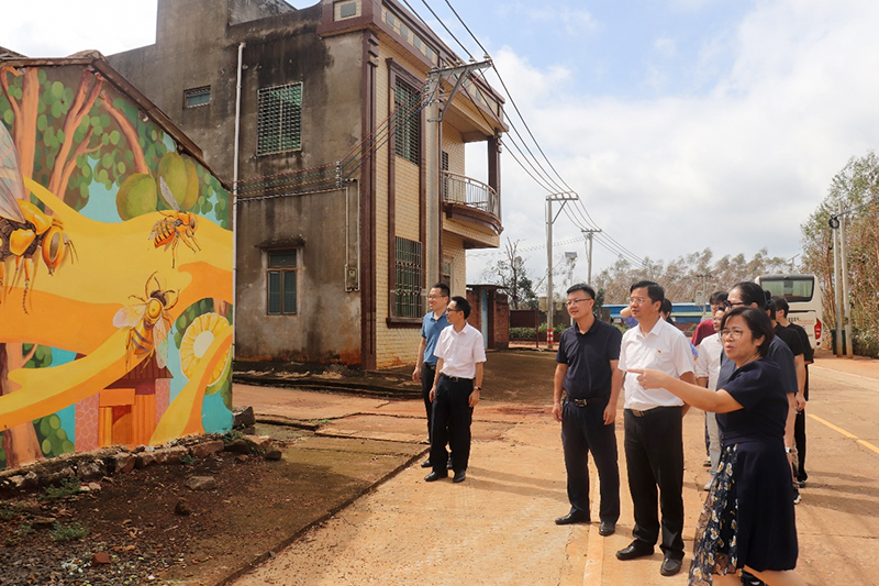 然后,一行到达项目组负责的墙绘区,一片鲜艳夺目的色彩,精描细绘的充满现代机械风的蜜蜂、栩栩如生的雷州特色瓜果、榕树,雷州石狗墙画赫然映入眼帘,墙绘内容充分体现了镇村特色,表达了乡村人勤劳进取的蜜蜂精神。