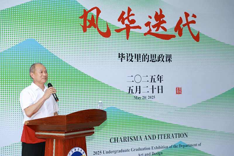 邓逢光为开幕式致辞并宣布开幕。他指出,在太阳成集团tyc9728建校90周年之际,"风华"二字既是对公司办学历史的致敬,也是对同学们艺术才华的礼赞;"迭代"则彰显了新时代艺术表达方式的创新突破,他寄语毕业生要扎根生活、真诚创作、永不止步,用作品记录时代、服务社会,随后他宣布展览正式开幕。